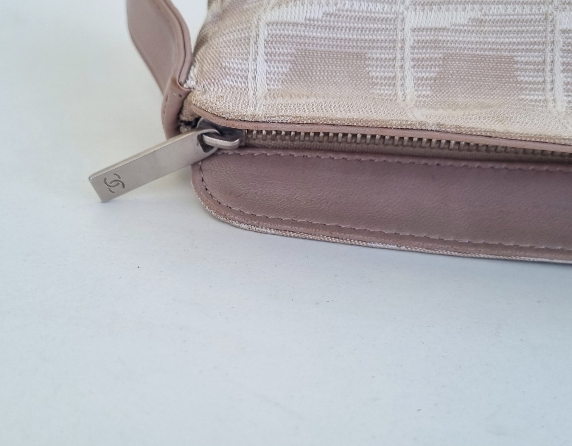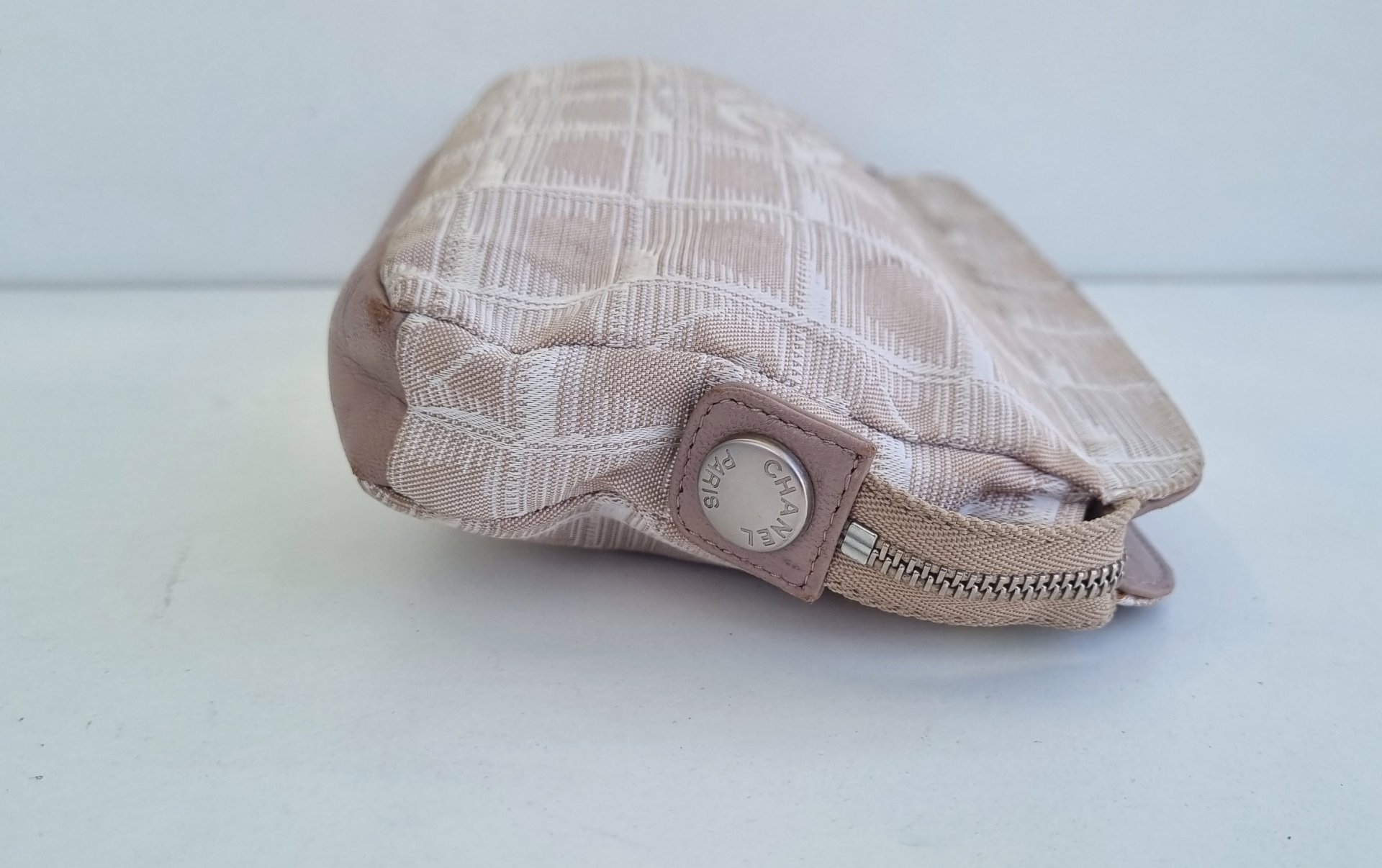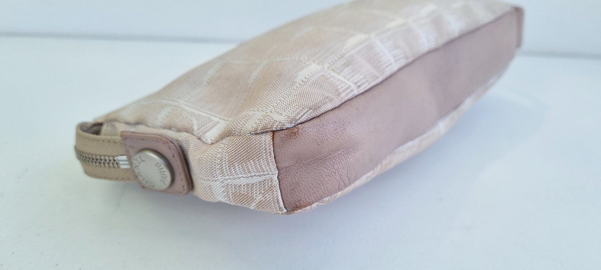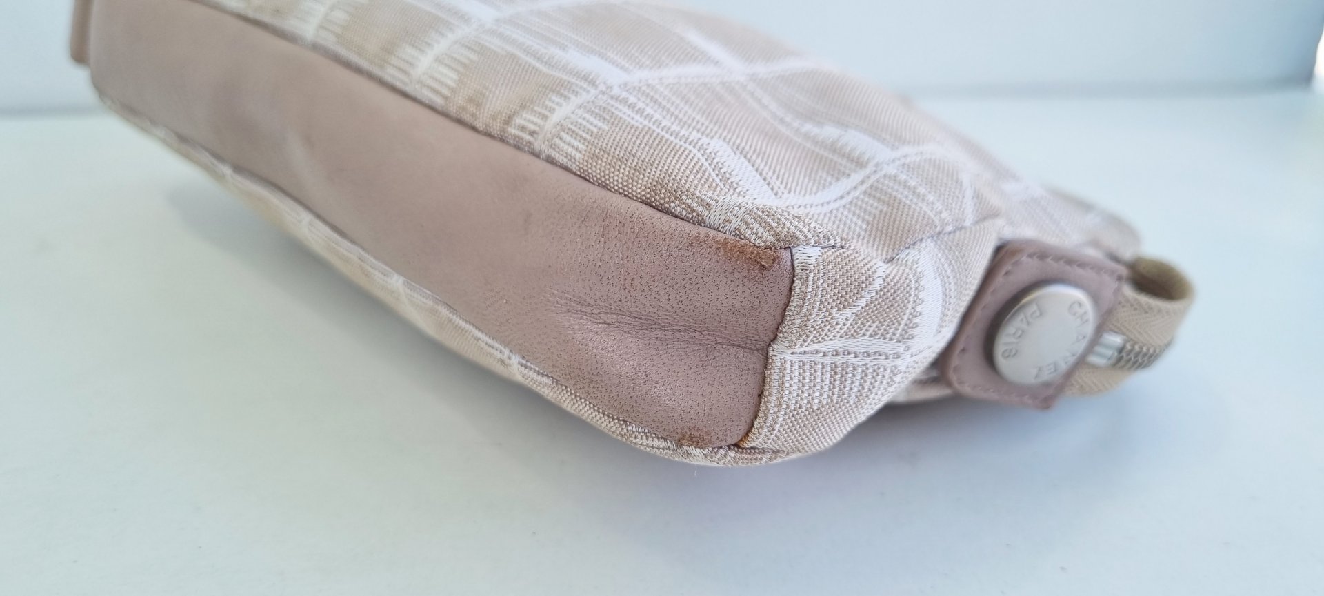 Canvas pouch with leather trim. Discoloration on the corners. Good condition. Practical for traveling or evening wear.