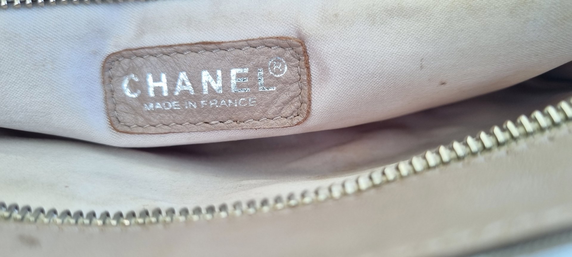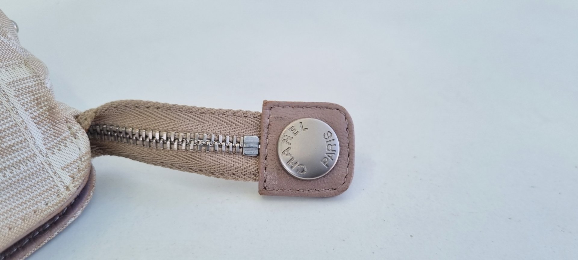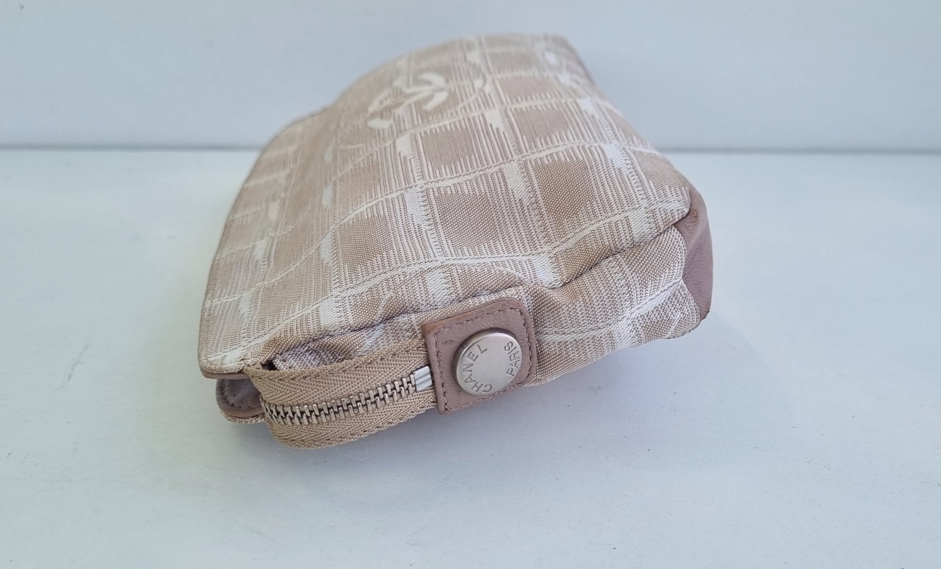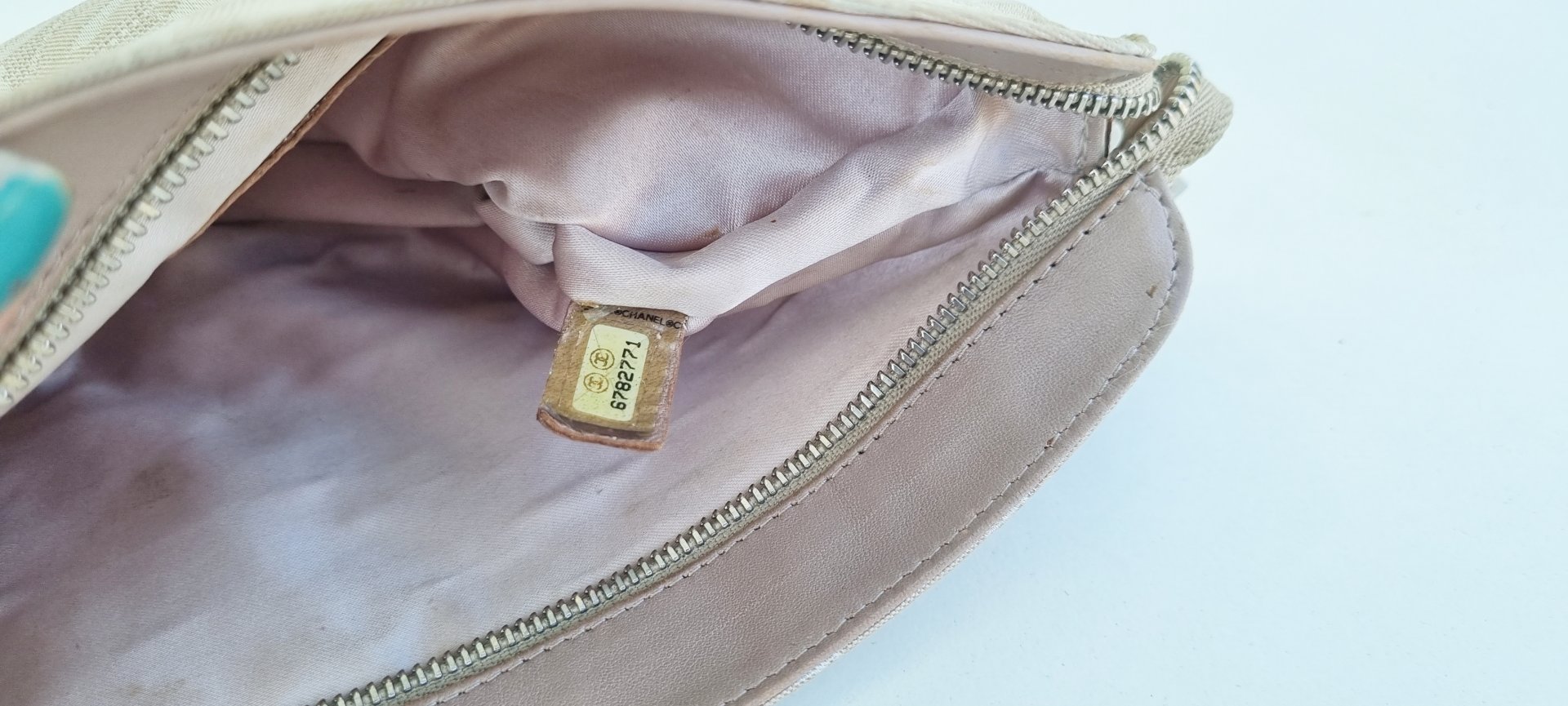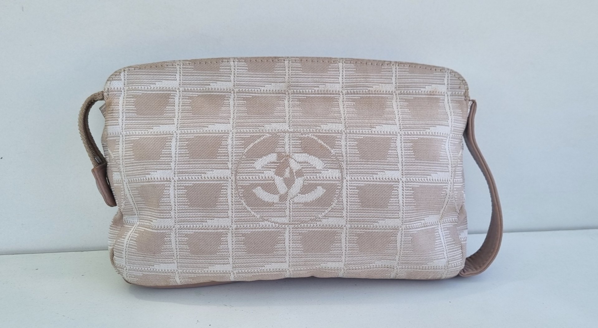 Canvas pouch with leather trim. Discoloration on the corners. Good condition. Practical for traveling or evening wear.